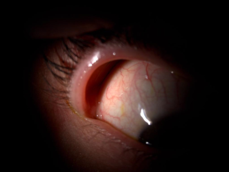 Avant de chercher des particularités sur la conjonctive tarsale, on va d’abord s’intéresser à l’aspect général. La rugosité ou l’aspect lisse va nous permettre de savoir si l’on a plutôt à faire à un œil sec ou bien humecté. Cela va également nous permettre de savoir si la conjonctive est en souffrance ou non. Pour examiner la rugosité, on peut aussi l’observer avec la lumière bleue. Selon une étude de C. Kunnen et al.2 la rugosité est mieux évaluée en lumière bleue. Par contre, la rougeur ou l’irrigation sanguine sera mieux évaluée en lumière blanche avec une fente, moyenne à large, positionnée à la verticale ou à l’horizontale. Il faudra donc bien séparer l’observation de la rugosité et de l’hyperémie.